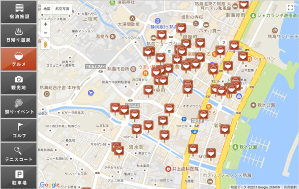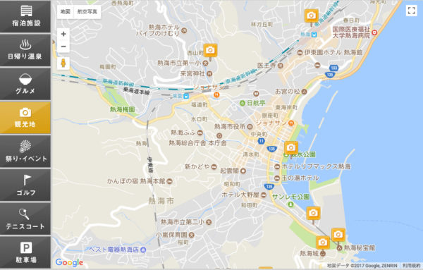熱海温泉ホテル旅館協同組合の公式サイト「熱海温泉お宿ナビ」には、「熱海観光地マップ」というページがあり、Google Maps上に観光地のアイコンが記され、そこをクリックすると詳細が見られる仕組みになっていて便利です=リンク